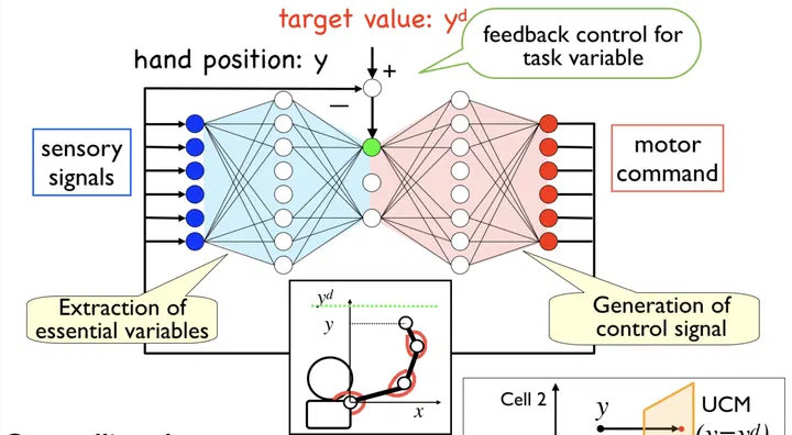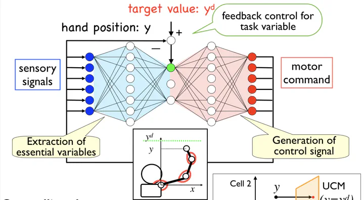 The brain extracts the essential information from the information from the huge number of sensors in the whole body every moment, and sends the appropriate motor command to the huge number of our muscles. In our laboratory, the learning mechanism how brain discovers essential information and acquire motor commands to control our highly redundant body.