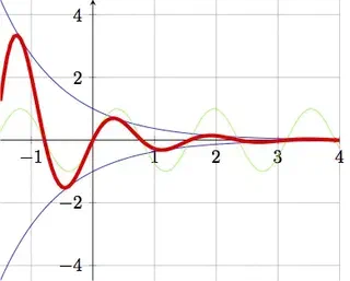 \addplot [color=red, line width=2]{exp(-x)*sin(deg(4*x))};
